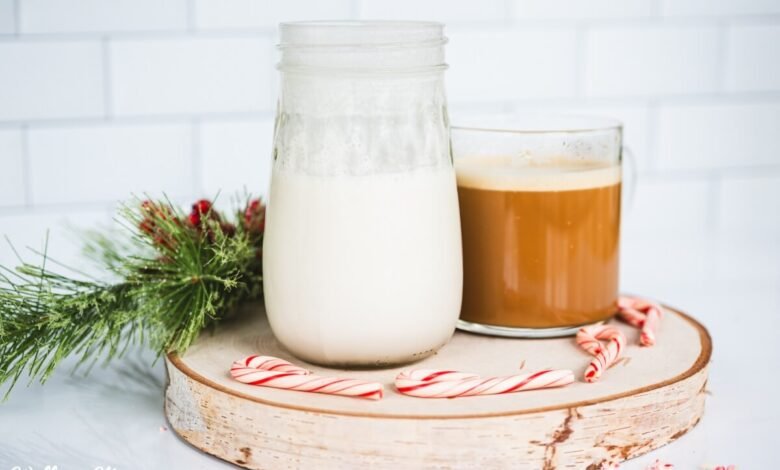 Dairy-free coffee creamer made with coconut milk, peppermint extract, and a touch of maple syrup.