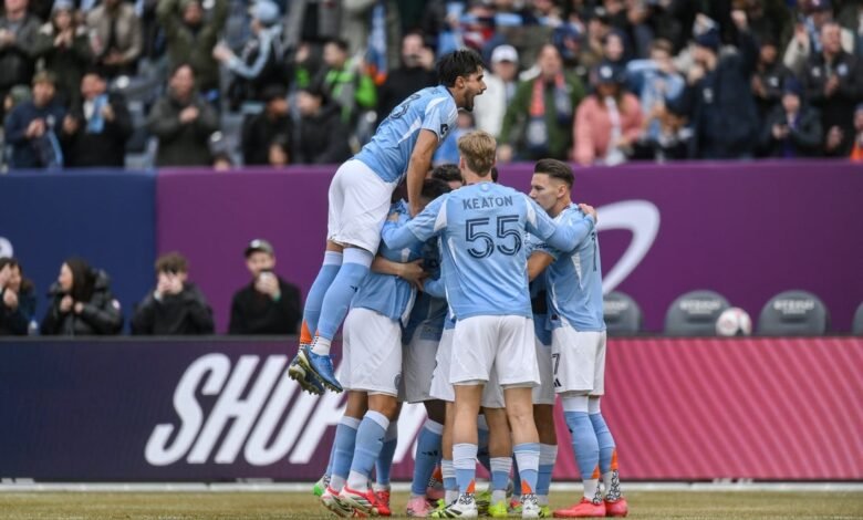 Mar 7, 2026; New York, New York, USA; New York City forward Agustín Ojeda (26) celebrates with teammates after scoring a goal against Orlando City during the first half at Yankee Stadium. Mandatory Credit: John Jones-Imagn Images Maxi Moralez scored on a penalty kick and collected two assists in a dominant first half, Keaton Parks scored twice early in the second and New York City FC continued their success in home openers with a 5-0 victory over Orlando City Saturday afternoon at Yankee Stadium.