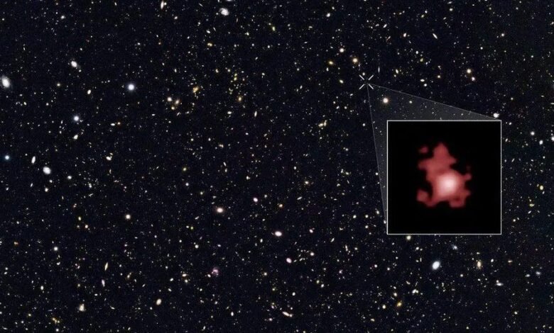 The Great Observatories Origins Deep Studies North field (GOODS-N), cropped to show the Universe’s most distant galaxy, in red. A combination of Hubble and Spitzer data was used to discover this galaxy, whose distance has been confirmed spectroscopically, including more precisely and spectacularly by JWST in 2023. (Credit: NASA, ESA, P. Oesch (Yale University), G. Brammer (STScI), P. van Dokkum (Yale University), and G. Illingworth (University of California, Santa Cruz))
