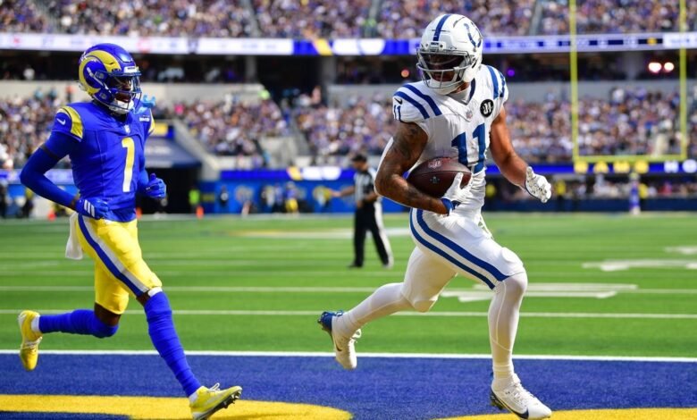 Sep 28, 2025; Inglewood, California, USA; Indianapolis Colts wide receiver Michael Pittman (11) scores a touchdown ahead of Los Angeles Rams cornerback Emmanuel Forbes Jr. (1) during the second half at SoFi Stadium. Mandatory Credit: Gary A. Vasquez-Imagn Images The Indianapolis Colts added wide receiver Michael Pittman to their Week 5 injury report Thursday with a hamstring issue.