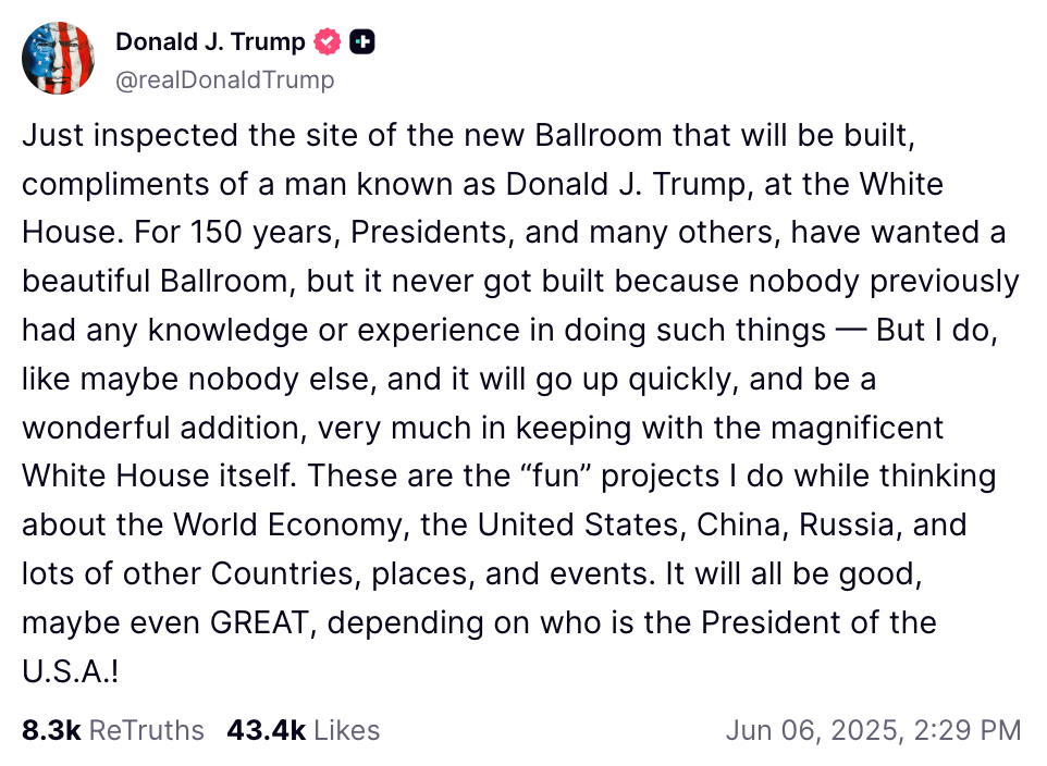 Trump started talking about building a White House ballroom before he even entered politics. It became clear that this was more than just weird Trumpian musing in June 2025, when he revealed on Truth Social that he’d selected a site for the project: