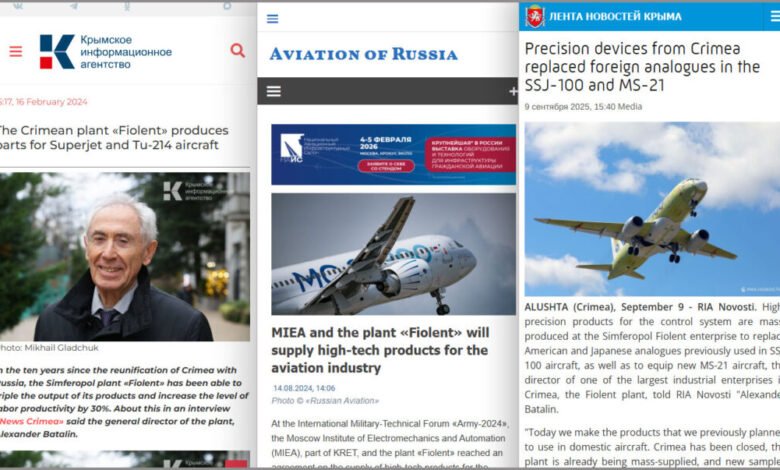 The report found that the Fiolent plant in occupied Sevastopol supplies key components for Russia’s regional airliner Sukhoi Superjet SJ-100, including rotary transformers, generators, motors, and precision electric machines such as sensors, inductor-based and rotary components used in power and control systems.
