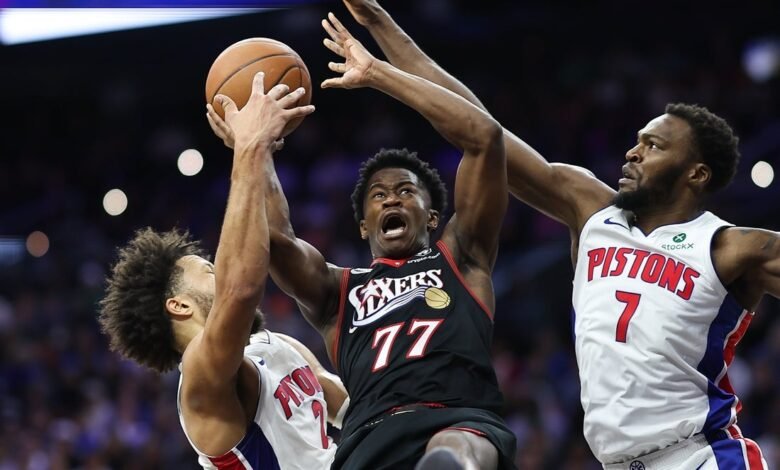 NBA: Detroit Pistons at Philadelphia 76ersNov 9, 2025; Philadelphia, Pennsylvania, USA; Philadelphia 76ers guard VJ Edgecombe (77) is fouled by Detroit Pistons guard Cade Cunningham (2) and forward Paul Reed (7) while driving for a shot during the third quarter at Xfinity Mobile Arena. Mandatory Credit: Bill Streicher-Imagn Images