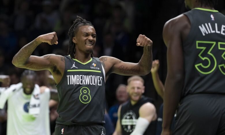 Nov 7, 2025; Minneapolis, Minnesota, USA; Minnesota Timberwolves guard Bones Hyland (8) reacts after forward Leonard Miller (33) makes a shot and gets fouled against the Utah Jazz in the second half at Target Center. Mandatory Credit: Jesse Johnson-Imagn Images The Minnesota Timberwolves are riding high after winning seven of their past eight games.