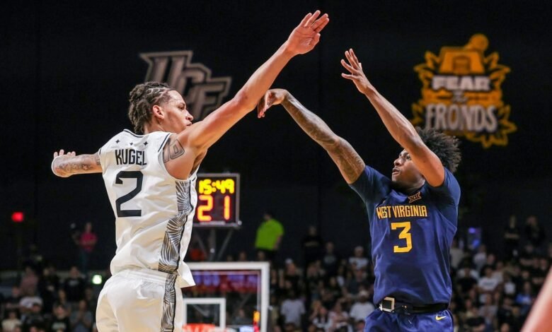 Feb 14, 2026; Orlando, Florida, USA; West Virginia Mountaineers guard Honor Huff (3) shoots a three-point basket against UCF Knights guard Riley Kugel (2) during the first half at Addition Financial Arena. Mandatory Credit: Mike Watters-Imagn Images Honor Huff scored 18 of his game-high 21 points in the second half and visiting West Virginia rallied from a 14-point deficit to stop Central Florida 74-67 on Saturday night in Orlando.