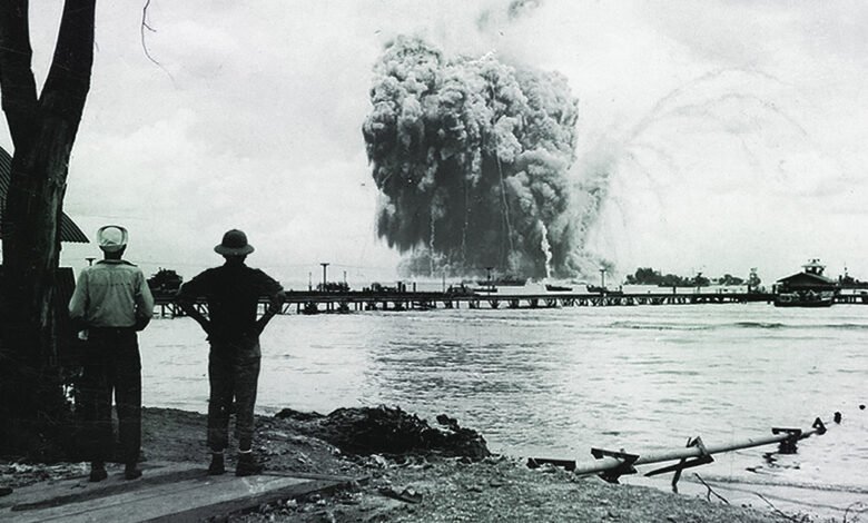 Wallace and his crew landed at the pier and disembarked to carry out their various chores. Just as they were separating, one of the sailors loudly exclaimed, “Look!” The boat crew turned to see an eruption of smoke and fire rising above Mount Hood. In seconds a powerful explosive concussion threw them to the ground. It took a full 12 seconds for the horrible sound of the exploding ship to reach them. Even from two miles away they could see dark shapes being ejected from the explosion and curving high into the sky. The lieutenant reacted immediately. “Back to the boat!” he yelled. He told the coxswain to make all speed to return to the scene. It took more than a quarter of an hour for the motor launch to reach berth 380. They found no ship, no bodies. “There was nothing but debris all around,” Wallace later wrote. Mount Hood and her crew of 350 had simply vanished.