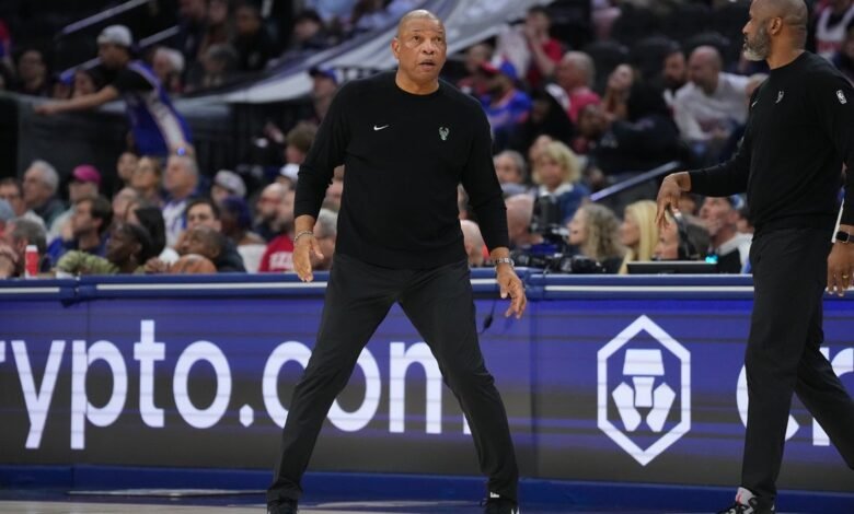 Apr 12, 2026; Philadelphia, Pennsylvania, USA; Milwaukee Bucks head coach Doc Rivers reacts against the Philadelphia 76ers in the second quarter at Xfinity Mobile Arena. Mandatory Credit: Kyle Ross-Imagn Images Doc Rivers is out as the head coach of the Milwaukee Bucks, according to a Sunday night ESPN report.