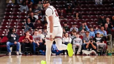 Dec 22, 2025; Columbia, South Carolina, USA; South Carolina Gamecocks forward Myles Stute (10) celebrates a three point basket against…